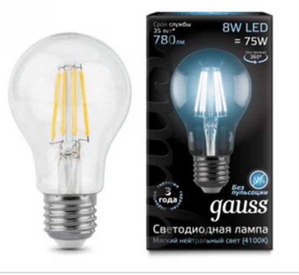Светодиодная лампа Gauss A60 8Вт 150-265В 4100К E27 филамент