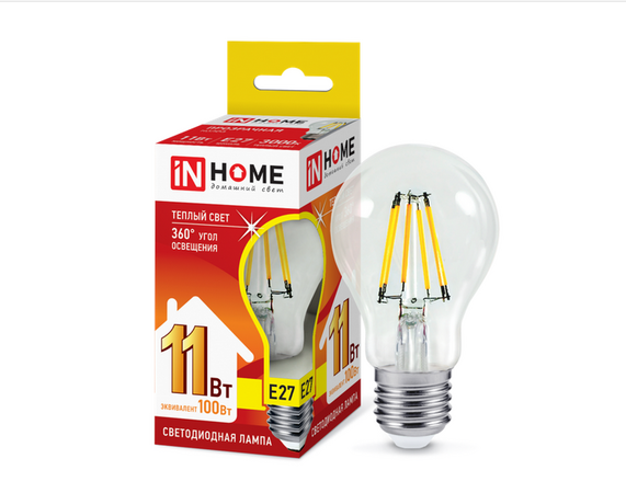 Светодиодная лампа IN HOME A60 11Вт 230В 3000К Е27 филамент
