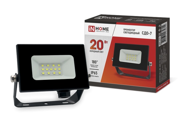 Прожектор светодиодный IN HOME 20Вт 6500К 1 600Лм IP65 230В 111х98х21 ЧЕРНЫЙ СДО-7