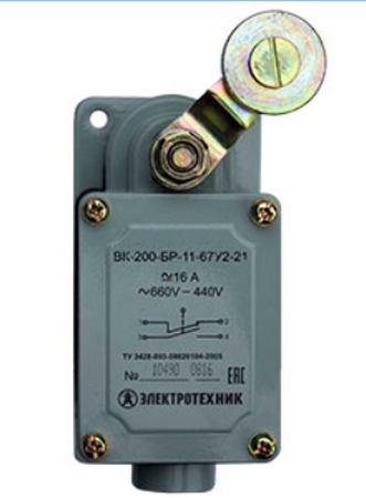Выключатель путевой ВК-200-БР-11-67У2-21 рычаг с/роликом, б/сальника ход вправо, cамовозврат, ступень 2- 51мм, IP67 (ЭТ)